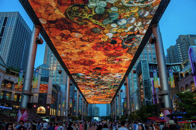 Nằm ở Bắc Kinh, The Place không chỉ là một trung tâm mua sắm, mà còn là một biểu tượng của sự hiện đại và sang trọng. Điểm nổi bật nhất của The Place chính là màn hình LED khổng lồ trên trần, một trong những màn hình ngoài trời lớn nhất thế giới, mang đến những trải nghiệm trực quan vô cùng ấn tượng cho du khách. Ban ngày, đây là bức tranh sống động với các hình ảnh và màu sắc rực rỡ. Còn về đêm, nó biến thành một bầu trời sao lấp lánh, tạo nên không gian mua sắm lãng mạn và huyền ảo.